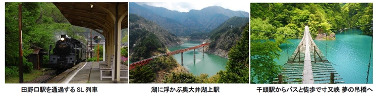 「大井川周遊きっぷ」は大井川鐵道、寸又峡線バス、閑蔵線バス全区間が乗り降り自由になるフリーきっぷ。夢の吊橋や奥大井湖上駅といった「奥大井エリア」の人気観光スポットを楽しむのに最適です。