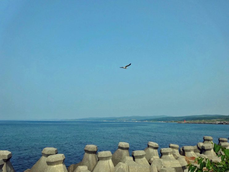少し望遠レンズにしました。赤い灯台の右奥は増毛港、左に留萌の町が見えます。
