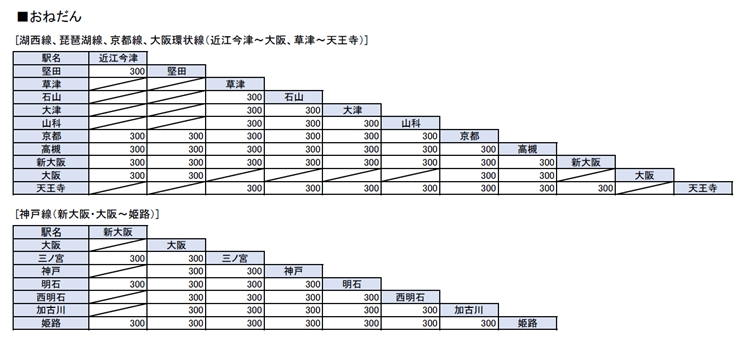 主な設定区間の値段は、京都~大阪、京都~天王寺、姫路~大阪いずれも300円。対象列車の指定席については定員の5割程度を上限として発売する。