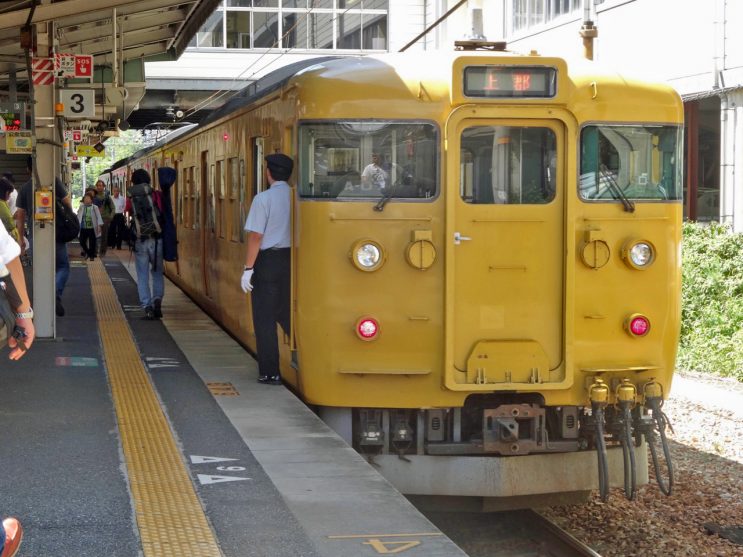 播州赤穂に行っても仕方ないので相生駅で降りました。12時53分ですが、13時31分の岡山行まで待ちます。暑いです。ホームには上部行の115系の黄色い電車が来ました。最近はすっかり見かけなくなりましたね。