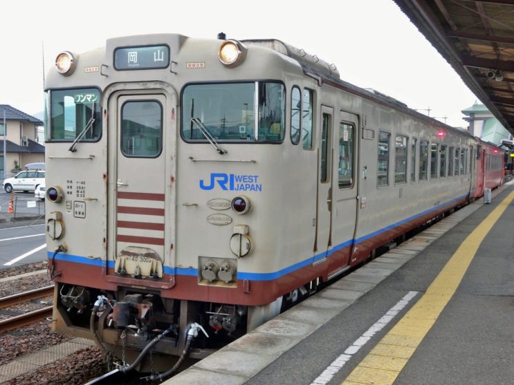 岡山側は、岡山色のキハ40-3003。14時54分発です。行先表示が岡山になって前照灯が点きました。出発します。