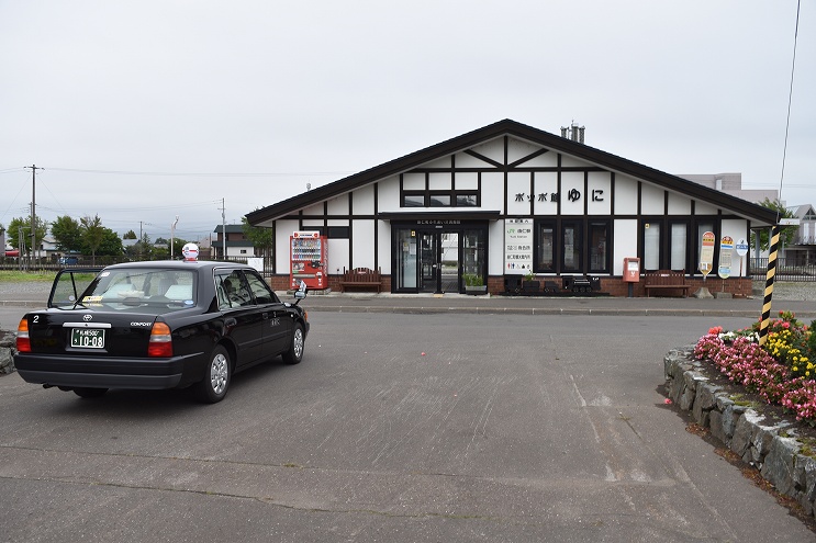 様々な魅力に溢れた由仁町ですが、知名度はいまひとつ。道内在住者でも正確に場所を言い当てられる人は少ないでしょう。列車の本数も少なく駅前も閑散としています。タクシーが一台、いつ来るかわからない客を待っていました。