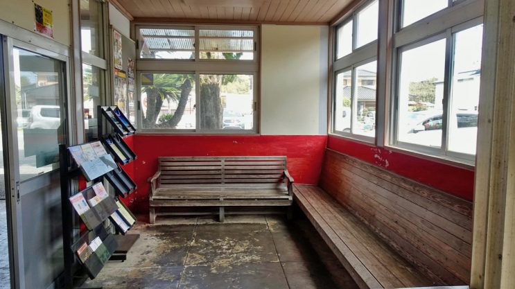 待合室には木製の作り付けベンチとクラッシックな木製ベンチ。