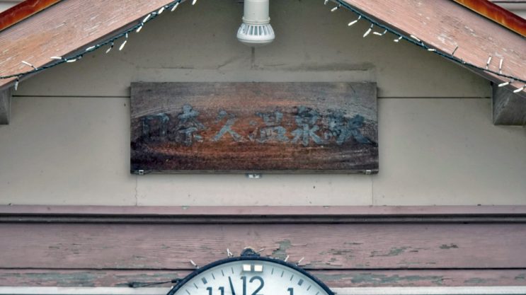 ちょうど正午。オナカが減ってきました。建物財産標は見つけられません。日奈久温泉駅駅舎は、開業当時のオリジナルです。肥薩おれんじ鉄道では最も古い駅舎。