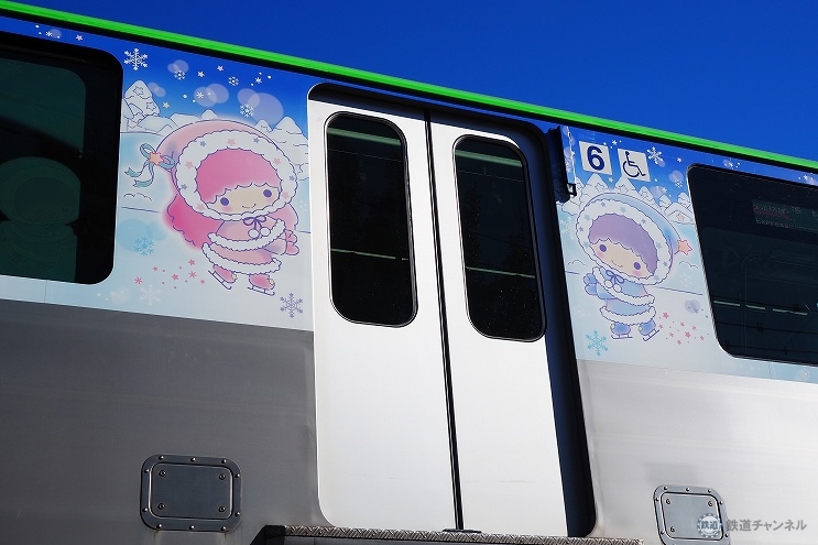 1号車・2号車・5号車・6号車の車内には、四季をイメージしたフルラッピングエリアを設けました。1編成目の「キキ&ララ モノレール」キラキラスター編成では運転台付近がフルラッピングエリアとなっていましたが、今回はそれぞれの車両の連結部付近に。