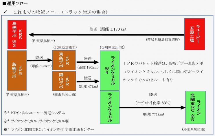これまでJPR、キユーピー、ライオンは、各社個別でトラック等を手配し、商品等の輸送を行っていました(JPR:九州~関西、キユーピー:関東~九州、ライオン:四国~関東)。