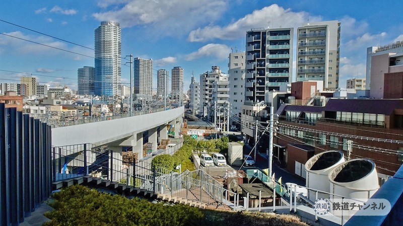 駐車場の屋上は反対側に抜ける通路になっています。左には東武伊勢崎線の高架線。円筒形の高層ビルの麓はこの後で訪れる曳舟の街です。