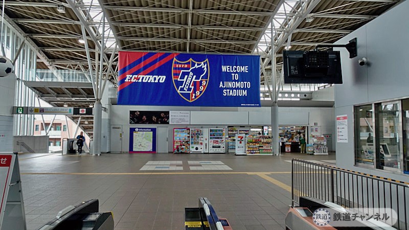 橋上駅舎、構内が広いのに驚きます。筆者もサッカーの試合を観に来た事がありますが、その時は凄い人の数に圧倒されていました。味の素スタジアム、収容人数は5万人と聞いた覚えがあります。