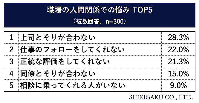 次に職場での人間関係の悩みについて聞いてみると、最も多かったのは「上司とそりが合わない」で28.3%、次いで「仕事のフォローをしてくれない」22.0%、「(人間関係において、好き嫌いなどで)正統な評価をしてくれない」21.3%だった。