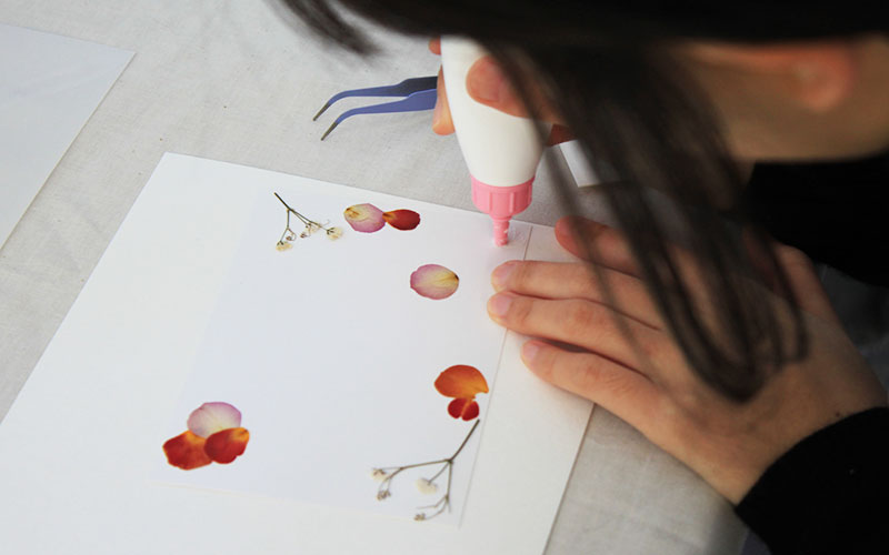 参加者たちは押し花を自由にカードに張り付け、オリジナルの押し花メッセージカードを作成し、大切な人へ向けて、会場から郵送することもできた。