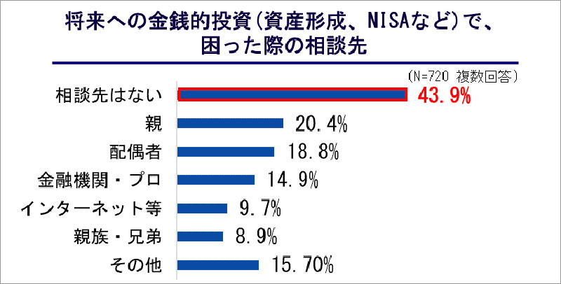 さらに、全体の40%以上が、将来への金銭的投資(資産形成、NISAなど)の困ったさいの相談先がないこともわかった。