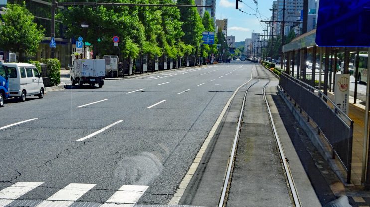 300mで西川緑道公園(にしがわりょくどうこうえん)停留場。1912年(明治45年/大正元年)の開業時は西川駅でした。2008年(平成20年)に現在の西川緑道公園停留場に改称されました。すみません、シャッターを切った瞬間に揺れたので微妙にブレていますね。天気は良いのですが日影を走っていることも多くて、コントラストが強く、予想外にブレている写真があります。御容赦ください。