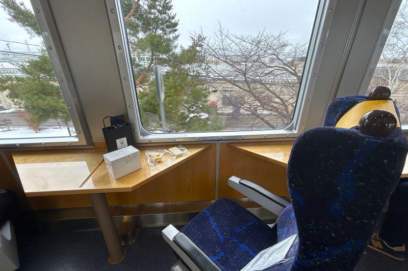上写真の右側には、窓を向いた2席ずつのカップル向けシートです。上写真の左側席はシングルシート仕様で並んでいますが、座席の向きを変更することで、斜めに向かい合わせになるペアシートの仕様になります。どの座席にもテーブルが備え付けられており、駅弁や飲み物を楽しみながらの優雅な列車旅が可能です。