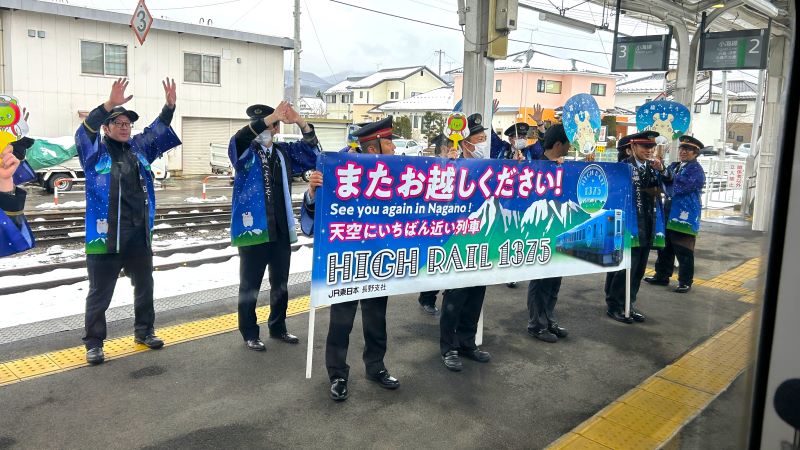 日中に運行をする列車では、車窓の景色をゆったりと楽しむことが出来ます。中込駅では、このツアーを北杜市と一緒に開発をしているJR東日本の関係者の方々の歓迎を受け、「HIGH RAIL1375」は進んでいきます。