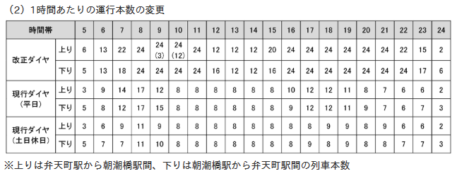 今回の主な改正内容として、ダイヤ種別は万博終了まで平日・土休日ともに統一します。1日の運行本数は上り376本・下り379本。1時間あたりの運転本数は次の表のとおりです。