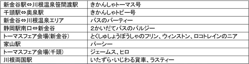 このイベントでは、「きかんしゃトーマス号」、「バスのバーティー」、「2かいだてバスのバルジー」、「ウィンストン」、「とくしゅしょうぼうしゃのフリン」、「ロコトレインのニア」と出会えます。