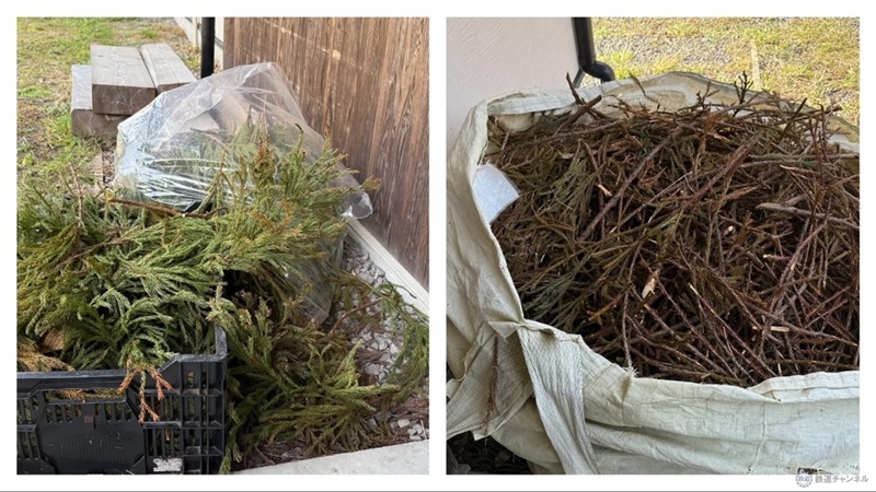 隣には精油の抽出を行なう工房があり、入口には小国杉の葉と枝の山が山積みになっていました。山で伐採した小国杉は建築材として売りに出されますが、枝葉の部分は不要とされ、山で放置されていたそうです。その枝葉を、ここではエッセンシャルオイルの材料として活用しています。