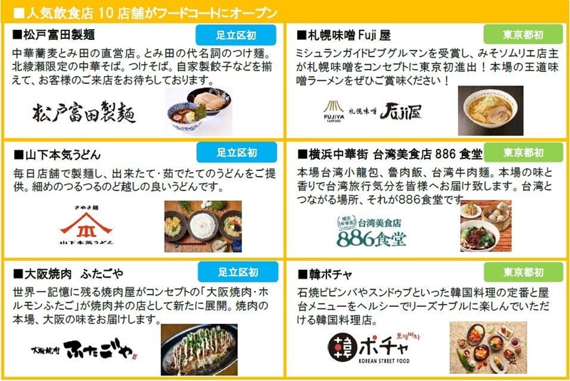 フードコートの注目の10店舗。「松戸富田製麺」「山下本気うどん」「大阪焼肉 ふたごや」(以上、足立区初)「札幌味噌 Fuji 屋」「横浜中華街 台湾美食店 886食堂」「韓ポチャ」(以上、東京都初)「大阪王将」「マクドナルド」「サーティワンアイスクリーム」「ミスタードーナツ」。