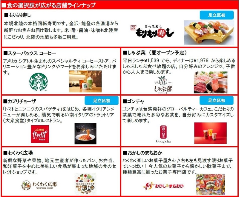 足立区初となる「もりもり寿し」「カプリチョーザ」「ゴンチャ」だけでなく、「スターバックス コーヒー」「しゃぶ葉(夏オープン予定)」「わくわく広場」「おかしのまちおか」なども。