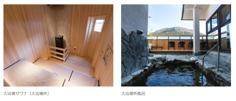 館内は「温泉エリア」と「館内着着用専用エリア(追加料金あり)」に分かれており、大浴場の外風呂にサウナや水風呂を備えます。温泉だけではなく大自然の中での“サ活”が楽しめるのが特徴。