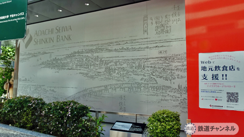 トップ画像は、北千住駅西側の旧日光街道を南下して大踏切通りとの交差点角にある足立成和信用金庫本店の壁面。「千住川」と読み取れる巨大なアートが飾られています。