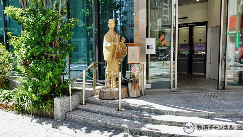 足立成和信用金庫本店出入口には、松尾芭蕉の木像。