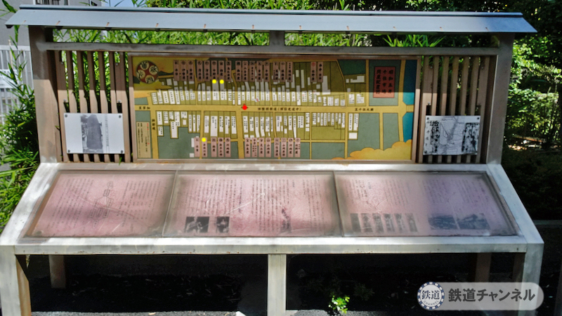 写真の赤い点が現在位置、この掲示の置かれている場所です。黄色は上で見た木札の問屋さん。