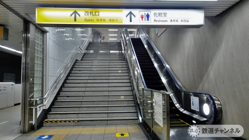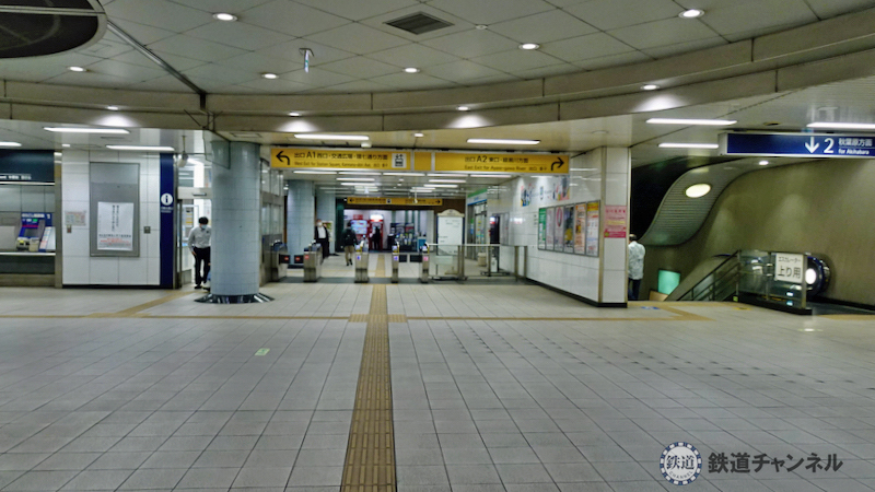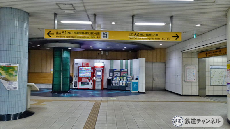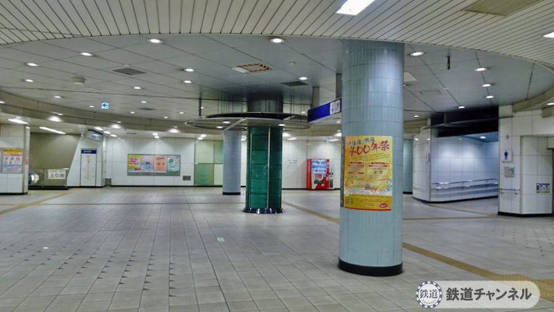 A1出口の方に行きます。西口、交通広場方面です。構内のメインとなる柱には、水柱を思わせる緑色の柱が、ここで反復されています。