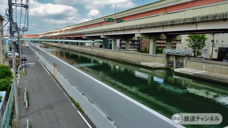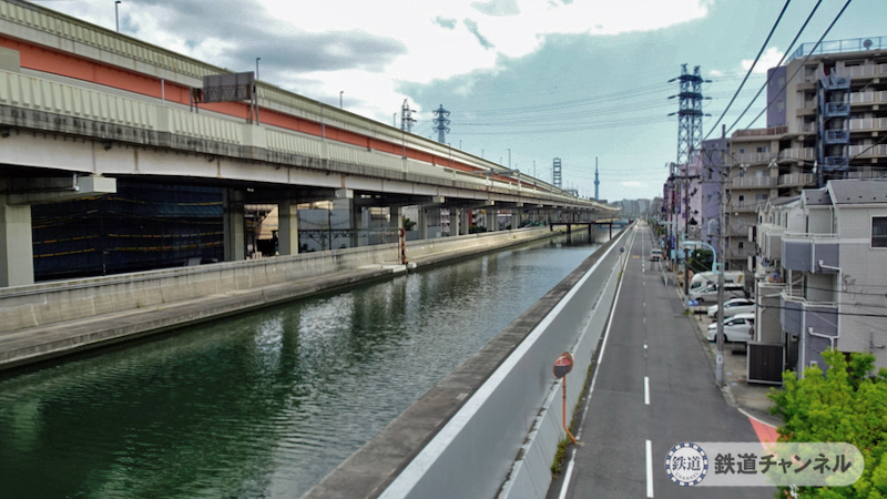トップ画像は、綾瀬川西側の都道102号線。先に見えている歩道橋で綾瀬川を渡ります。しかし高い塀がすごく長く続いています。ちょっと不思議な風景です。