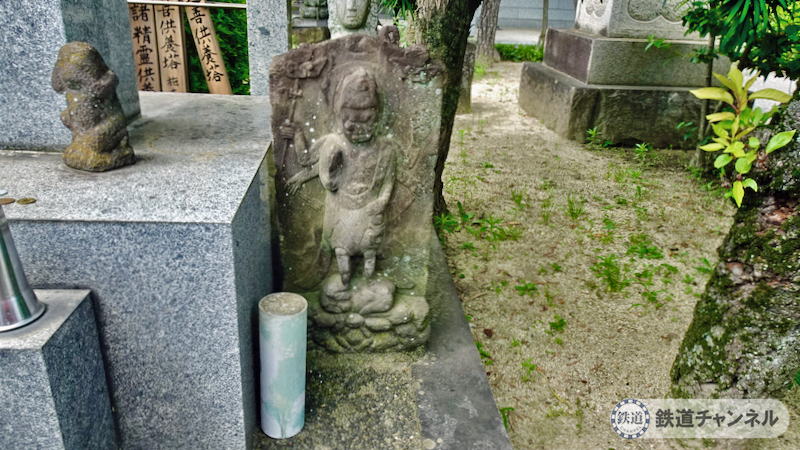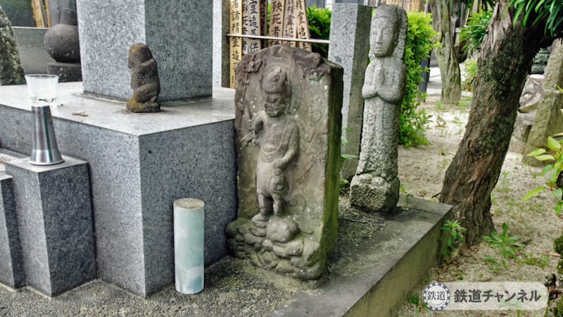 これが「本堂への参道両側の石垣台上の石造聖観音及び地蔵坐像」。足立区登録有形文化財です。両方とも礎石に「幸手屋」「万右衛門」と刻まれています。
