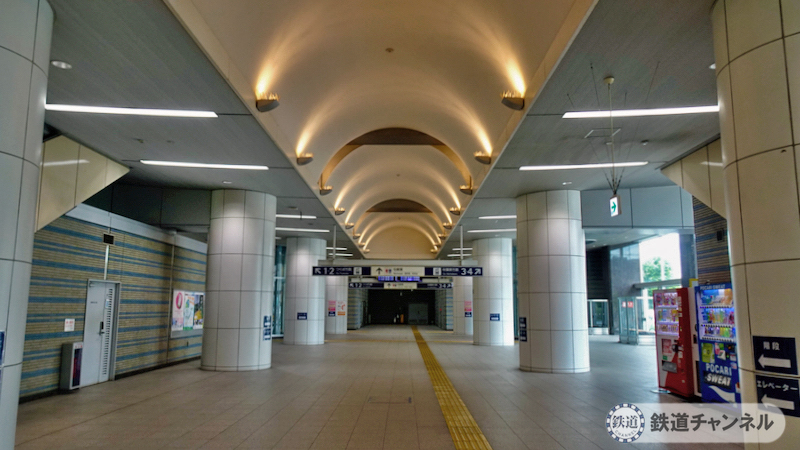 八潮駅のデザインの特徴は、この天井のヴォールトと照明ですね。