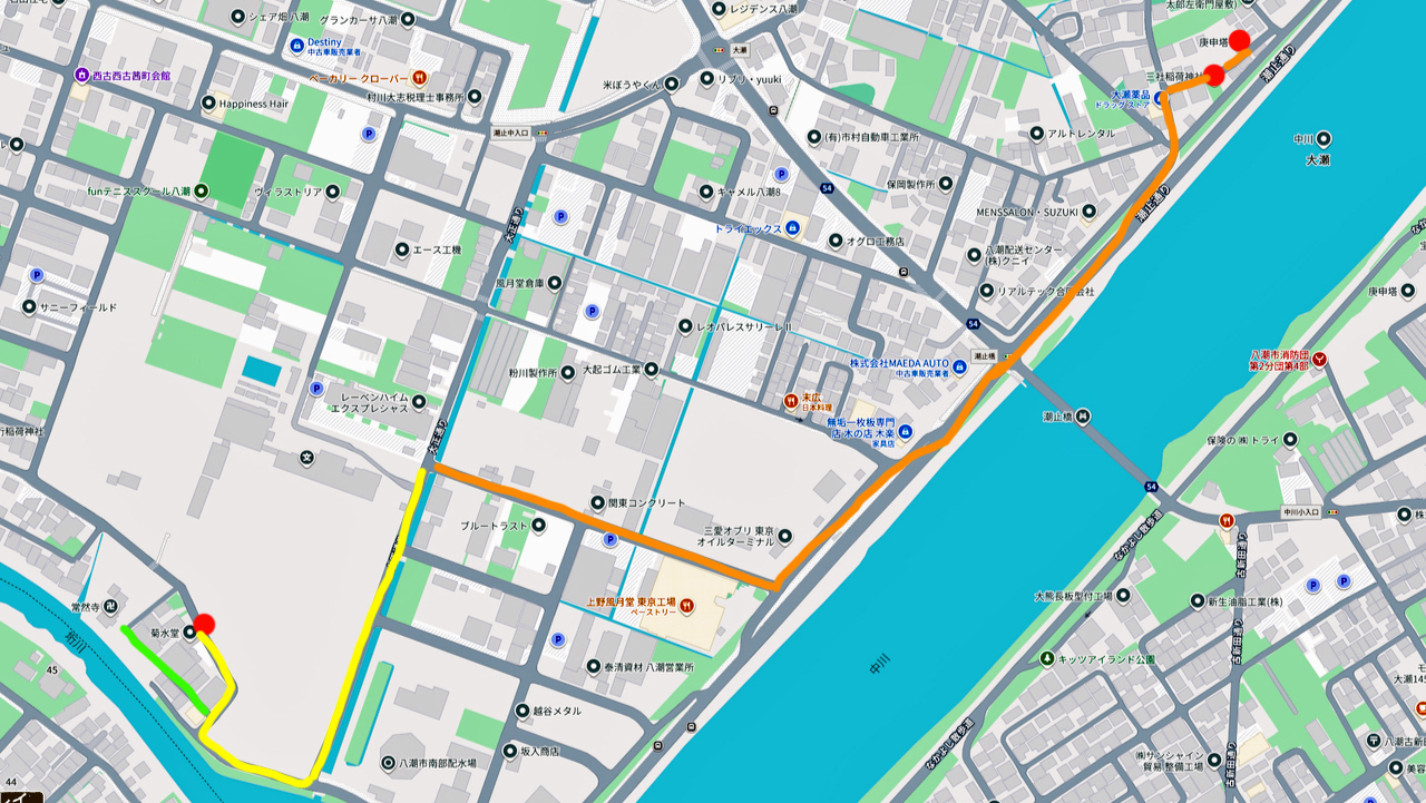 ちなみに、黄色いラインが、筆者が勘違いして無駄に歩いてきたコース。グリーンが本来の正しいコース。オレンジ色は、ポテトチップス屋さん取材の後、行こうと考えていた右上の神社と庚申塔へのコース。