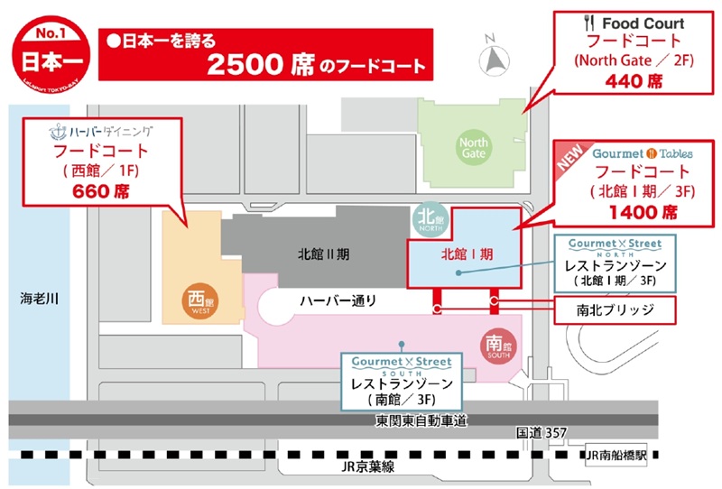 北館Ⅰ期エリアでの新たなフードコートの整備により、北館・西館・North Gateに位置するフードコートを合わせて2,500席となり、日本一の座席数のフードコートが誕生します。
