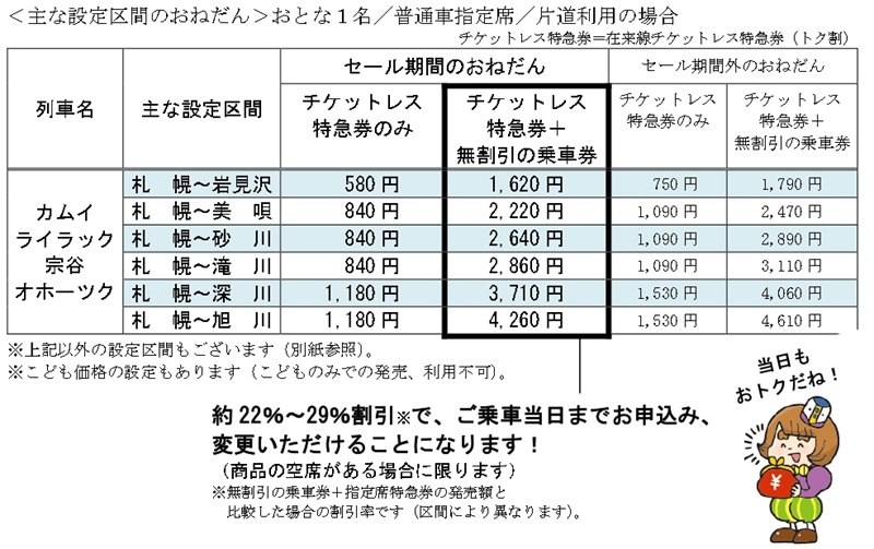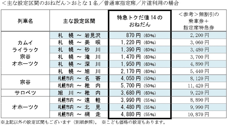 価格例: 札幌〜旭川間が2,170円(通常5,440円) 、札幌市内〜稚内間が5,700円(通常11,420円)。