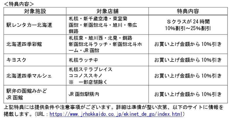 「特急トクだ値」または「チケットレス特急券」を予約した「えきねっと」マイページなどを提示すると、駅レンタカー北海道の割引や、北海道四季彩館、キヨスク、駅弁の函館みかどでの10%割引など、旅行中に役立つ特典も受けられます。