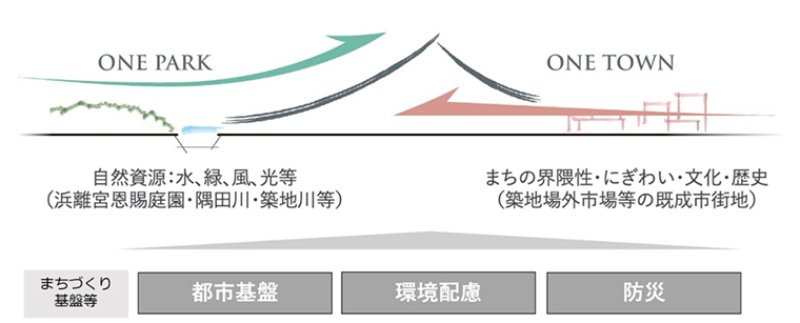 計画は「ONE PARK」「ONE TOWN」の2つのコンセプトを軸に、水辺に広がる緑地や舟運ルートの整備で“水の都・東京”を再生し、銀座の文化や築地の食文化、汐留のビジネス機能と連携して、交流と都市活動を育むとしています。
