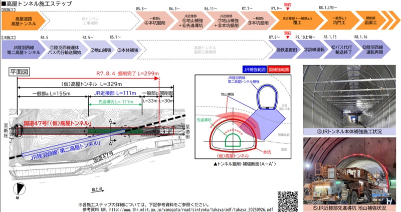 山形県新庄市の新庄駅から同県東田川郡庄内町の余目駅までを結ぶJR陸羽西線(りくうさいせん)の長期運転休止は、国土交通省が建設する国道47号高屋道路の「(仮) 高屋トンネル」工事が原因でした。この道路トンネルが、陸羽西線の古口駅・高屋駅間にある鉄道トンネルと極めて近接して交差するため、列車運行の安全を確保する目的で、2022年5月14日から全線で列車の運転を休止し、バスによる代行輸送が実施されてきました。