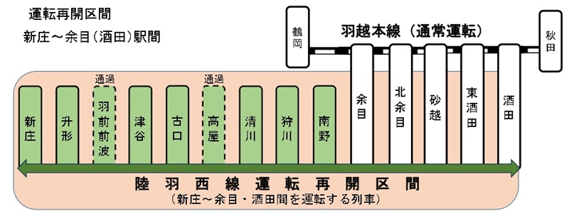 運転再開日は1月16日始発列車から。それにともない、バスによる代行輸送は1月15日に終了となります。運転再開後の運行区間は新庄~余目・酒田駅間で、新庄~余目駅間が1日5往復、新庄~酒田駅間が1日4往復、合計9往復の運行となります。