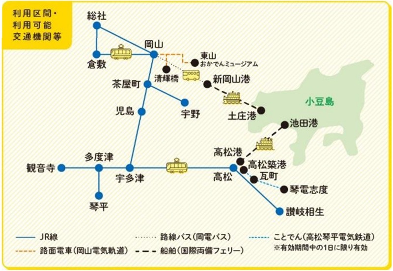 利用できる交通機関は、JR線は岡山・倉敷・総社から高松・琴平・観音寺・讃岐相生までの快速含む普通車自由席、岡山電気軌道の路面電車(全路線)、岡電バスの岡山駅~新岡山港間も利用できます。ただし、岡電バスは乗車または降車のいずれかで新岡山港バス停を利用する場合に限り利用可能です。
