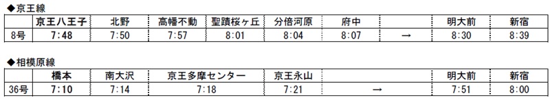 対象列車は、朝の通勤・通学に便利な上り2本、「7:48京王八王子発→ 8:39新宿着 の 京王ライナー8号」と、「7:10橋本発→ 8:00新宿着の 京王ライナー36号 」です。