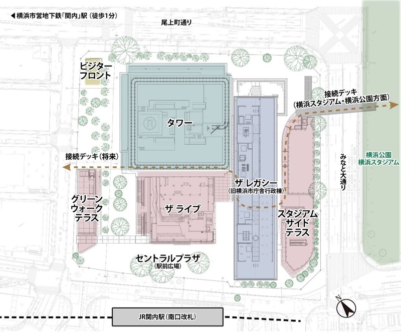エリア内には、オフィスフロアを中心として関東学院なども入居する地上33階の「タワー棟」、ホテル「OMO7 横浜 by 星野リゾート」や「有隣堂」が入る「ザ レガシー」、ライブビューイングアリーナがメインの「ザ ライブ」、商業店舗が並ぶ「グリーンウォークテラス」「スタジアムサイドテラス」などが配置されています。