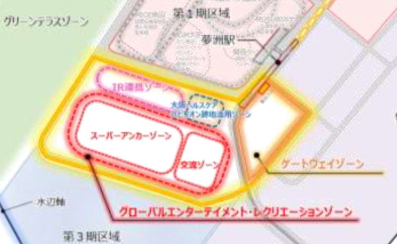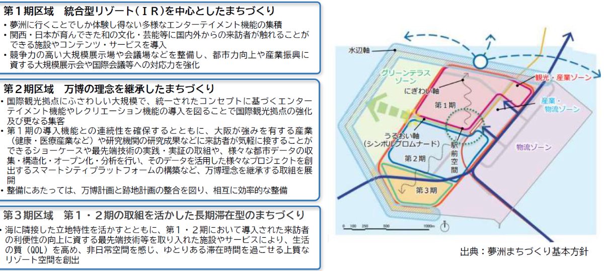 約390haの埋立地「夢洲」では、万博の敷地跡となる第2期の整備区域に先行して、隣接する第1期の区域で、2023年4月に国の認定を受けた「大阪・夢洲地区特定複合観光施設区域の整備に関する計画」に基づいた統合型リゾート(IR)の整備が進められています。