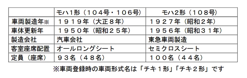 スペックは別表の通りで、いずれも戦前生まれ。3両とも戦後に車体を新調したが、更新から数えても70年前後を経過する。