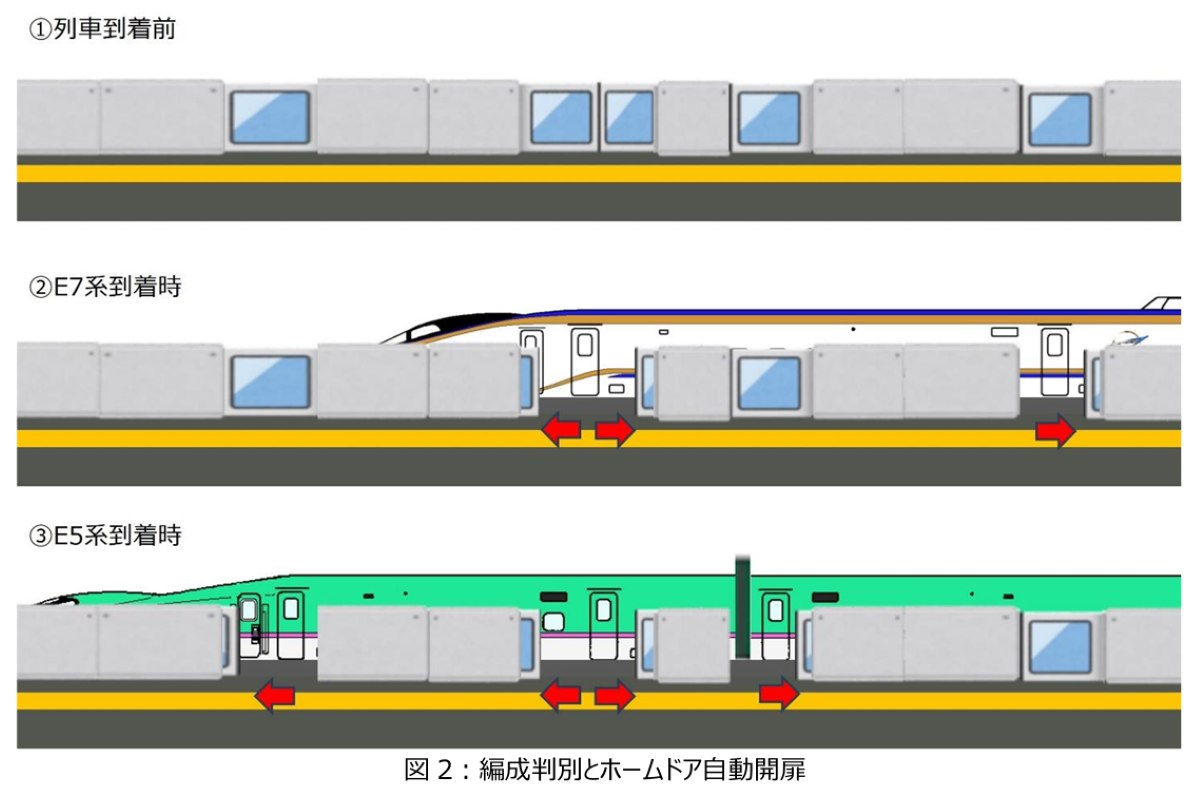 東京駅にはE5系、E7系、E8系など、ドアの位置や数が異なる様々な種類の新幹線が発着します。今回導入されるホームドアは、これらの多種多様な編成に対応できる特別なレイアウトで設置されます。