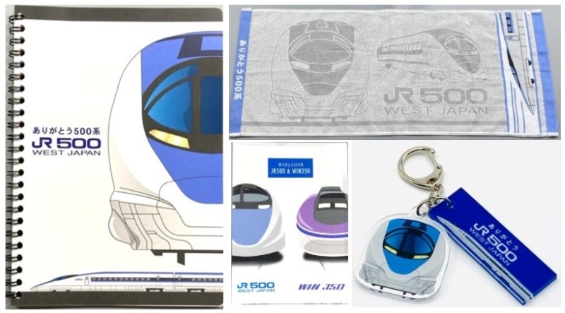 10月10日に登場するのは、500系とその原型となった試験車「WIN350」がデザインされたクリアファイル、車両正面と「ありがとう500系」のプレートが付いた2連アクリルキーホルダー、様々な角度の500系がデザインされたジャガードフェイスタオル、そして正面と側面のイラストが表紙のA5リングノートの4点です。
