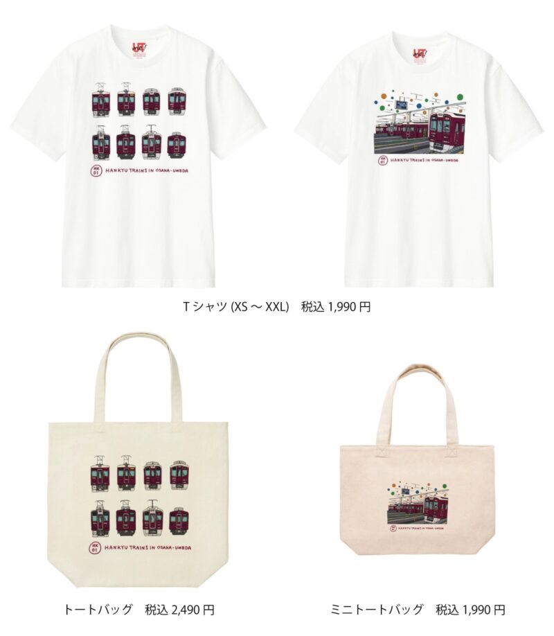 2025年10月24日(金)に開業する「UNIQLO UMEDA」で販売される阪急電車とのコラボレーション商品は、ユニクロ限定のオリジナルデザインTシャツ(税込1,990円)、トートバッグ(税込2,490円)、ミニトートバッグ(税込1,990円)です。