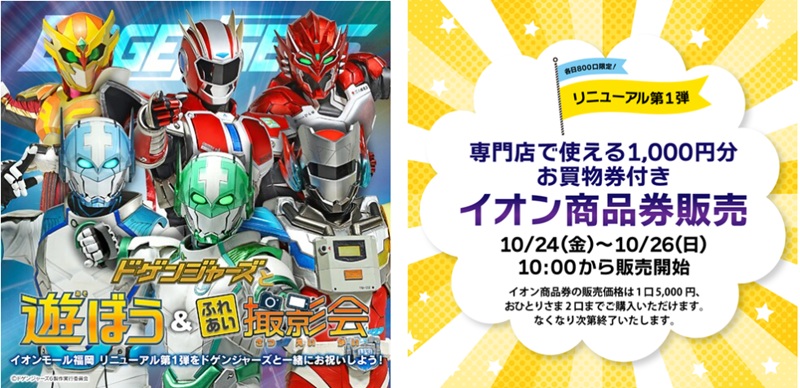 リニューアルオープンを記念したイベントとして福岡を舞台にした特撮作品「ドゲンジャーズ」のヒーローたちがイオンモール福岡に集合する「ドゲンジャーズと遊ぼう&ふれあい撮影会」が開催されます。10月24日(金)に1階イーストコートで、13時~と18時~の2回開催します。