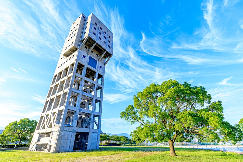 「イオンモール福岡」から南側に歩くと、1941~1943年にかけて建設された「旧志免鉱業所堅坑櫓(きゅうしめこうぎょうしょたてこうやぐら)」があります。国の重要文化財に指定され、47.65メートルの高さを誇る、近代の鉄筋コンクリート構造物の中でも有数の高層構造物です。かつてこの地域は炭田が広がっていて、この建物は採炭夫の昇降や石炭の搬出に使用されていました。第二次世界大戦終戦前に建設され、現存する竪坑櫓は世界に3ヶ所だけ。貴重な石炭産業遺産です。