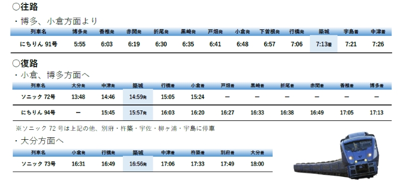 アクセスに関して、JR九州が航空祭に合わせて臨時列車の運転や特急列車の臨時停車を発表しています。臨時特急列車が4本運転されるほか、多くの特急列車が最寄りの築城駅に臨時停車、臨時普通列車「築城基地航空祭号」も45本運転される計画です。詳細はJR九州のホームページなどで確認することをおすすめします。