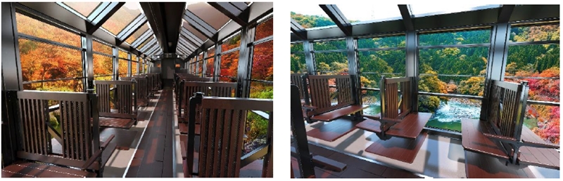 【一般席(1~4号車)】 一般席(1~4号車)では、景色が主役として映えるよう、柱や窓枠を黒で仕上げ、保津峡の景色への没入感を高めるデザインを採用します。